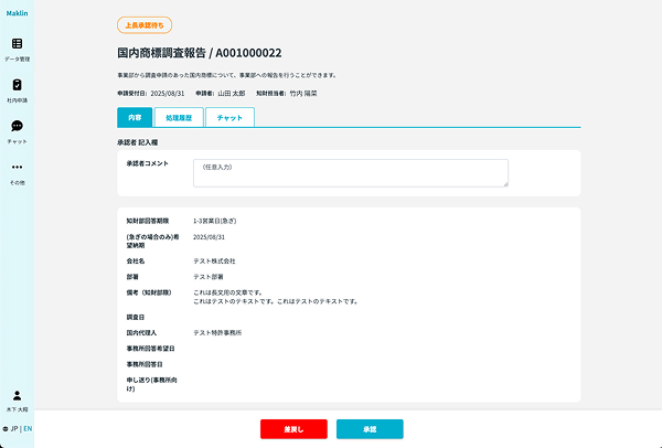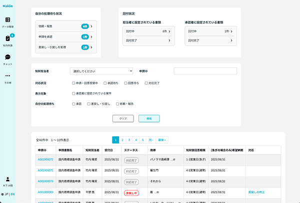 事業部 ⇔ 知財部 ⇔ 特許事務所の間で、案件依頼〜承認・報告までをクラウド上で回覧。